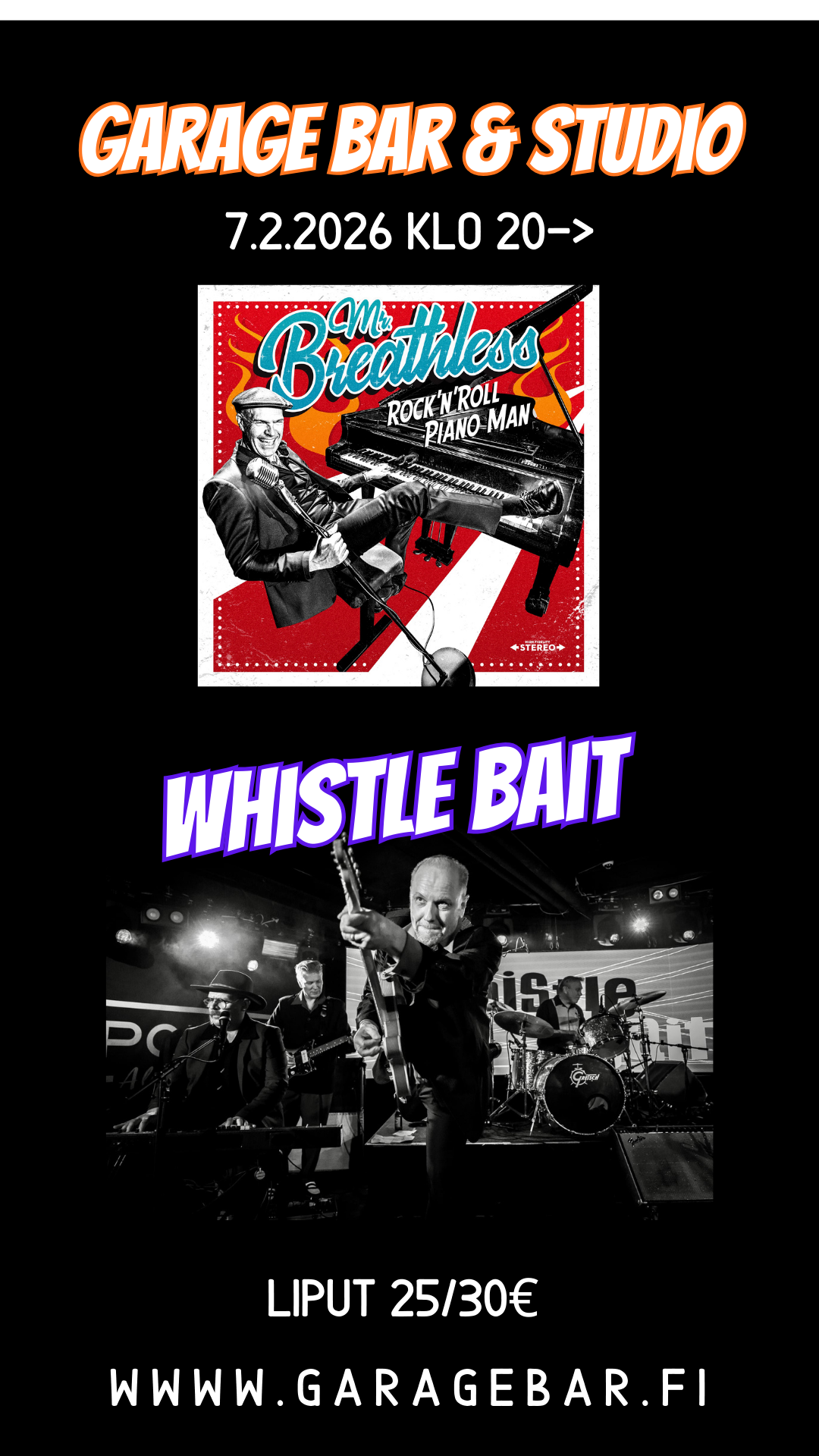 Valmistaudu talven kovaäänisimpään iltaan, kun Garage Baarin lavalle nousee lauantaina 7.2. kaksi genrensä rautaisinta nimeä. Illan itseoikeutettuna tähtenä loistaa hurjasta lavashow'staan tunnettu Mr Breathless, joka saa pianon koskettimet savuamaan ennennäkemättömällä energialla. Hänen seuranaan nähdään suomalaisen rockabillyn ja rhythm'n'bluesin legenda Whistlebait, jonka pettämätön tyylitaju ja tarttuvat rytmit takaavat tanssilattian kuumenemisen.